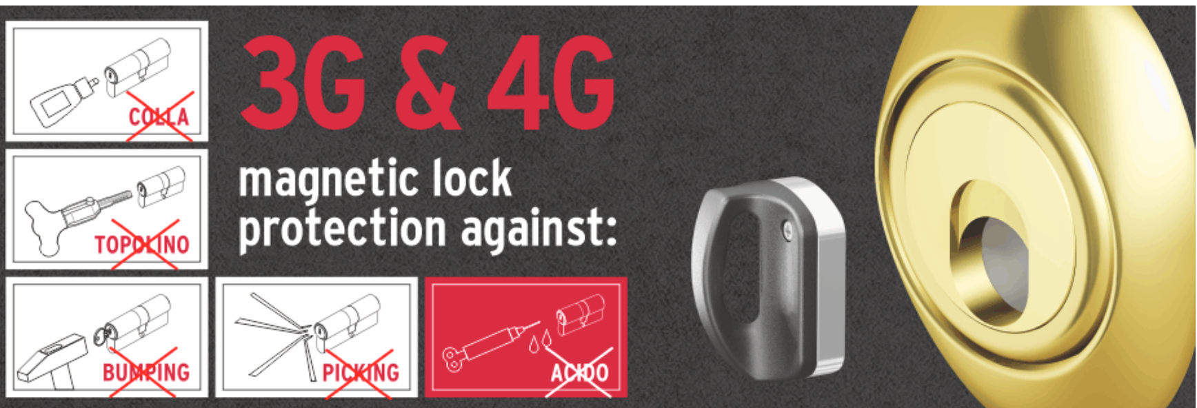 • Tecnologia magnetica: utilizza chiavi magnetiche codificate per l'apertura, aumentando la sicurezza rispetto ai cilindri meccanici tradizionali.